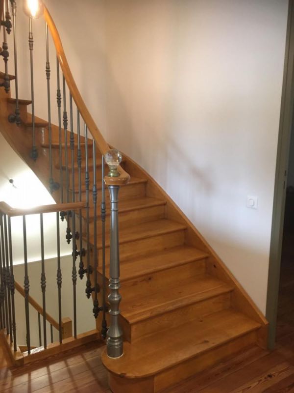 DESCRIPTIF: Marche de départ arrondie, balancement entre 6 et 8 marches, limons découpés, angles débillardés, poteaux tournés, rampe chevignon. ASSEMBLAGES: Main courante fixée aux poteaux par chevilles à tire. Balustres fer fixés sur le côté du limon et dans la main courante. SECTIONS: Limons 54mm – Marches 34mm – Contremarches 20mm – Balustres fer diamètre 16mm – Poteaux 85x85mm – Main courante 54x46mm ESSENCES DE BOIS: Sapin – Pin – Hêtre – Frêne – Chêne